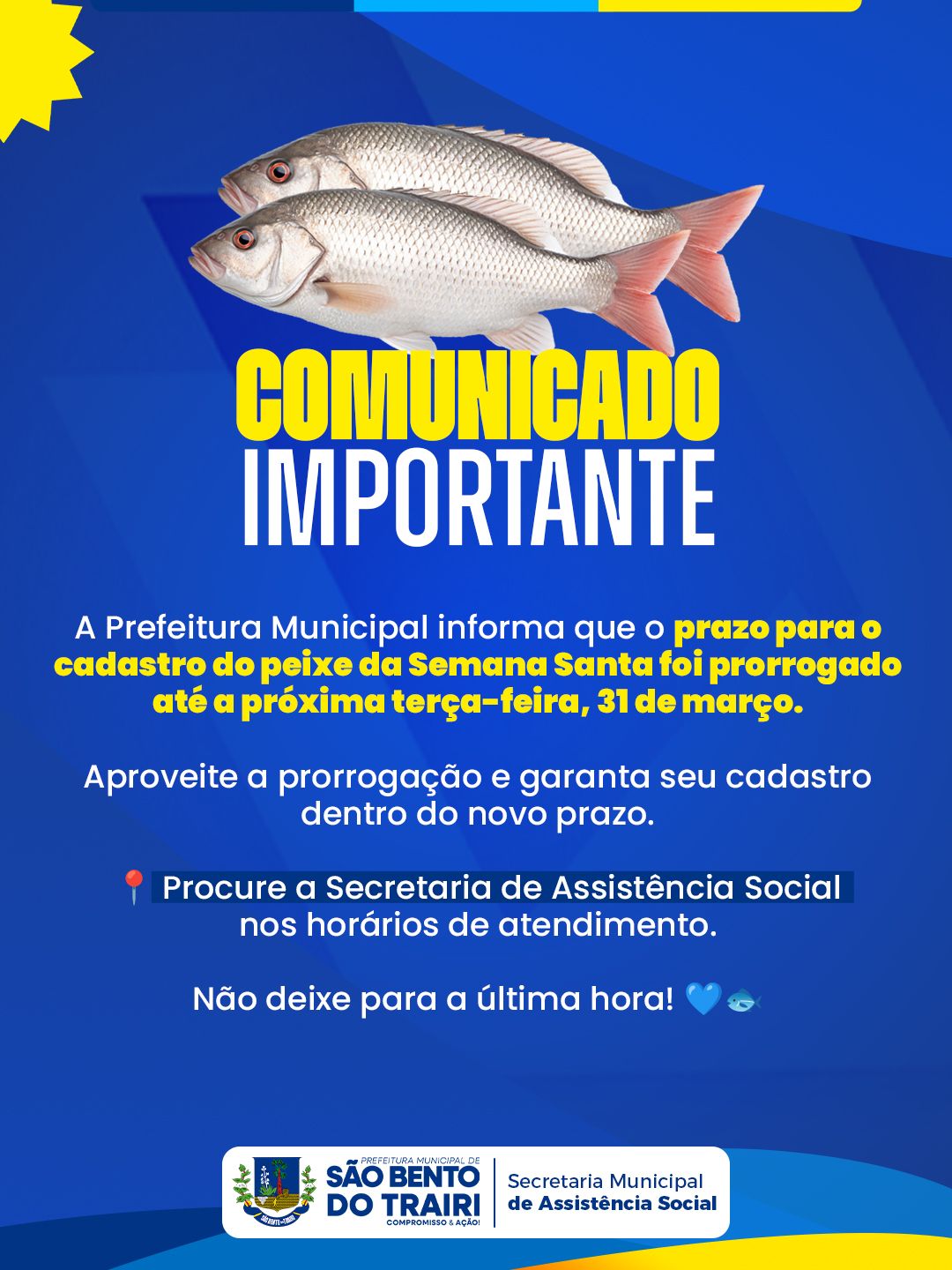 A Prefeitura Municipal informa que o prazo para o cadastro do peixe da Semana Santa foi prorrogado até a próxima terça-feira.