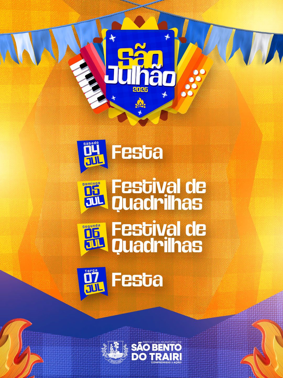 Prepare-se para viver o melhor do nosso São João! O São Julhão 2026 já tem data marcada em São Bento do Trairi: de 4 a 7 de julho.