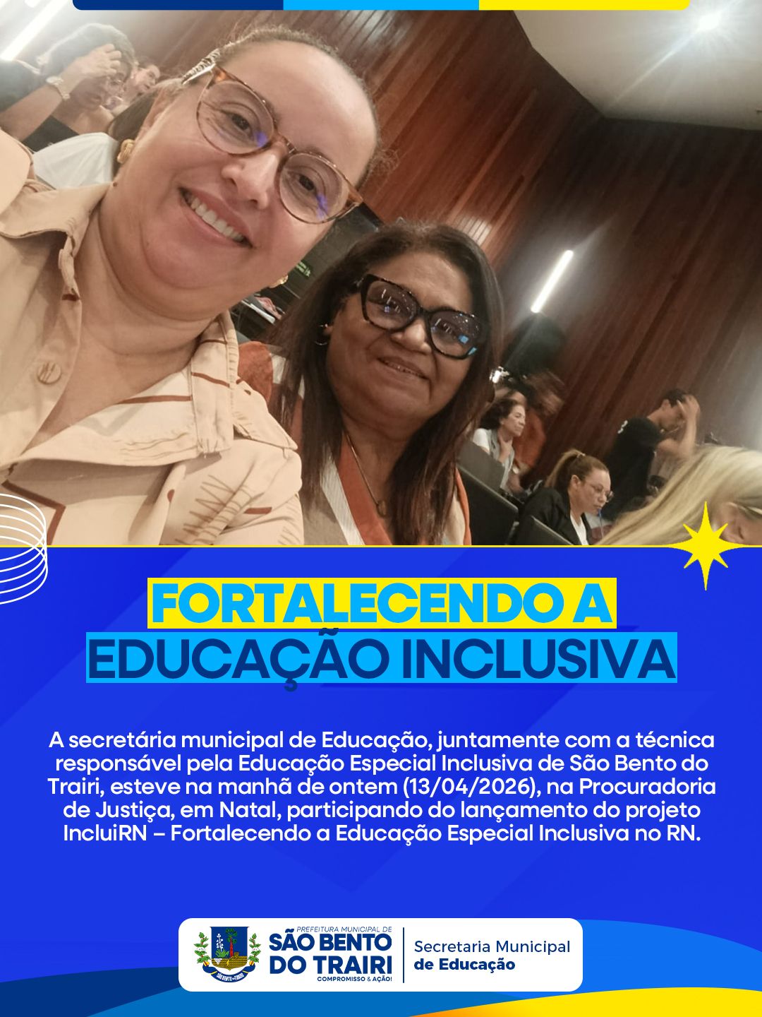 A secretária municipal de Educação, juntamente com a técnica responsável pela Educação Especial Inclusiva de São Bento do Trairi, esteve na manhã de ontem (13/04/2026), na Procuradoria de Justiça, em Natal, participando do lançamento do projeto IncluiRN – Fortalecendo a Educação Especial Inclusiva no RN.
