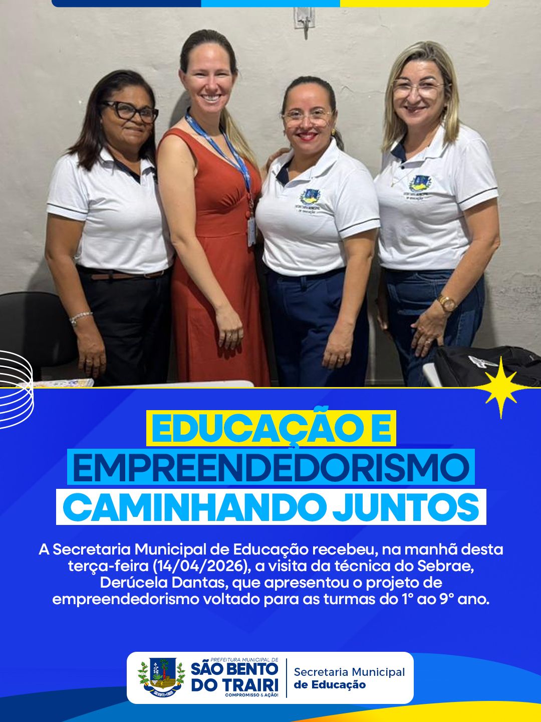 A Secretaria Municipal de Educação recebeu, na manhã desta terça-feira (14/04/2026), a visita da técnica do Sebrae, Derúcela Dantas, que apresentou o projeto de empreendedorismo voltado para as turmas do 1º ao 9º ano.