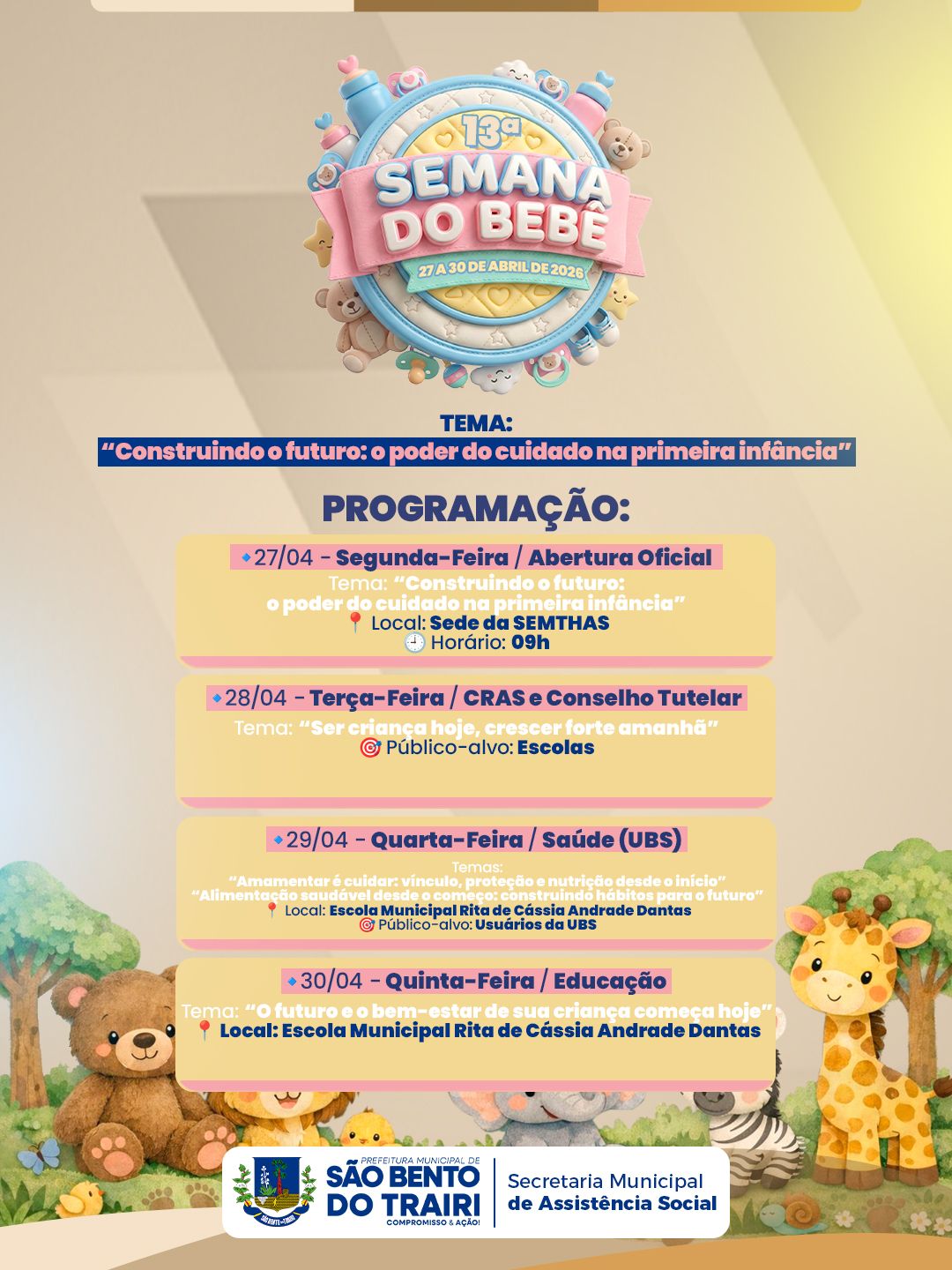 Com o tema “Construindo o futuro: o poder do cuidado na primeira infância”, a Prefeitura de São Bento do Trairi realiza mais uma edição da Semana do Bebê, reforçando a importância do cuidado, da proteção e do desenvolvimento integral das nossas crianças.