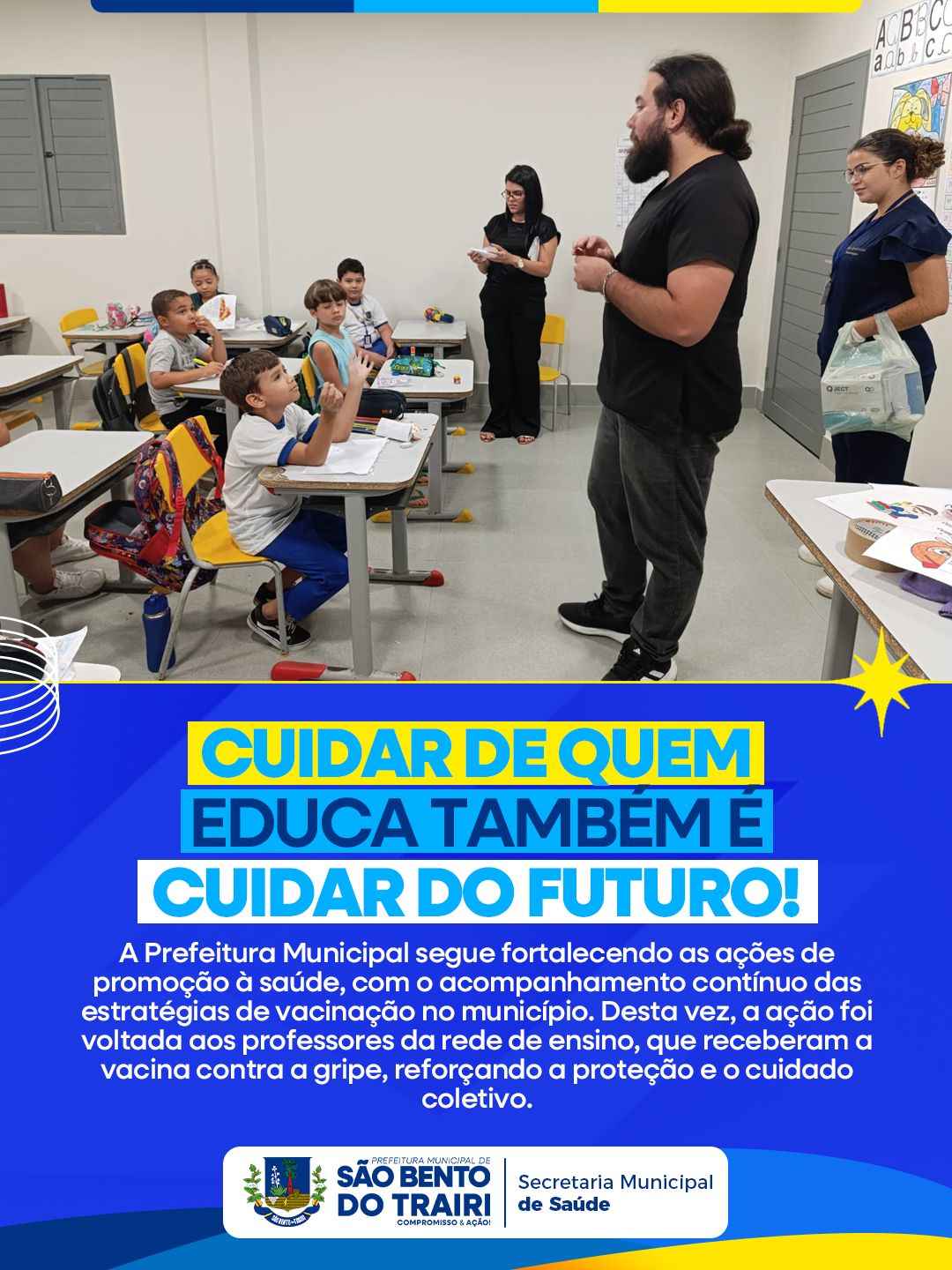 A Prefeitura Municipal segue fortalecendo as ações de promoção à saúde, com o acompanhamento contínuo das estratégias de vacinação no município. Desta vez, a ação foi voltada aos professores da rede de ensino, que receberam a vacina contra a gripe, reforçando a proteção e o cuidado coletivo.