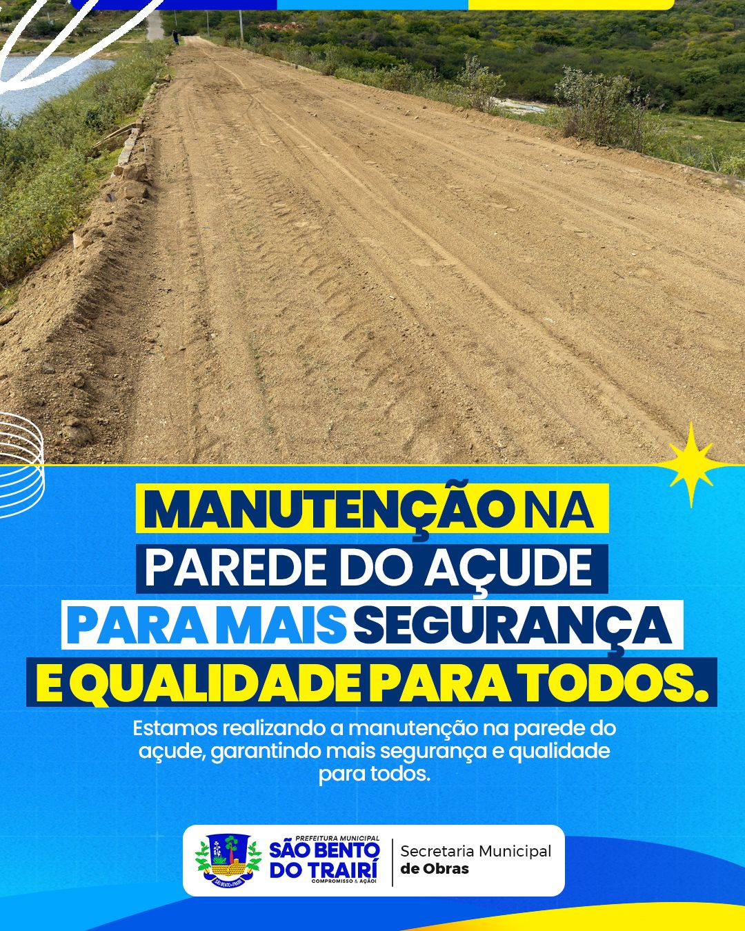 A Prefeitura de São Bento do Trairi continua trabalhando para melhorar a infraestrutura do nosso município! Estamos realizando a manutenção na parede do açude, garantindo mais segurança e qualidade para todos. Esse serviço é essencial para fortalecer a estrutura e preservar esse importante reservatório de água, que beneficia toda a população. Com planejamento e ação, seguimos transformando nossa cidade e cuidando do que é essencial para o nosso povo!