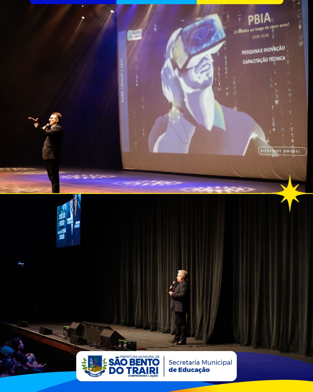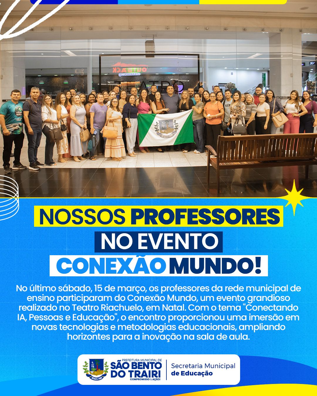 Nossos professores no evento Conexão Mundo! No último sábado, 15 de março, os professores da rede municipal de ensino participaram do Conexão Mundo, um evento grandioso realizado no Teatro Riachuelo, em Natal. Com o tema “Conectando IA, Pessoas e Educação”, o encontro proporcionou uma imersão em novas tecnologias e metodologias educacionais, ampliando horizontes para a inovação na sala de aula. Essa é mais uma ação da Prefeitura Municipal e da Secretaria de Educação, reafirmando o compromisso com a valorização dos nossos professores e a busca contínua por uma educação de qualidade. Investir no conhecimento é transformar o futuro!