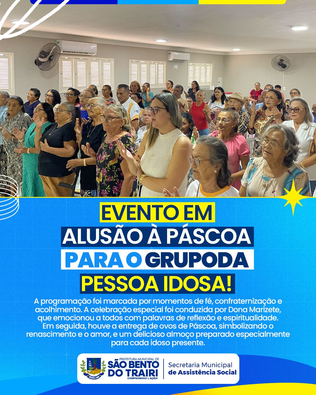 Nesta quarta-feira, 16 de abril, a Secretaria Municipal de Assistência Social realizou uma belíssima comemoração de Páscoa para o Grupo da Pessoa Idosa, promovendo um momento especial de união, afeto e valorização.