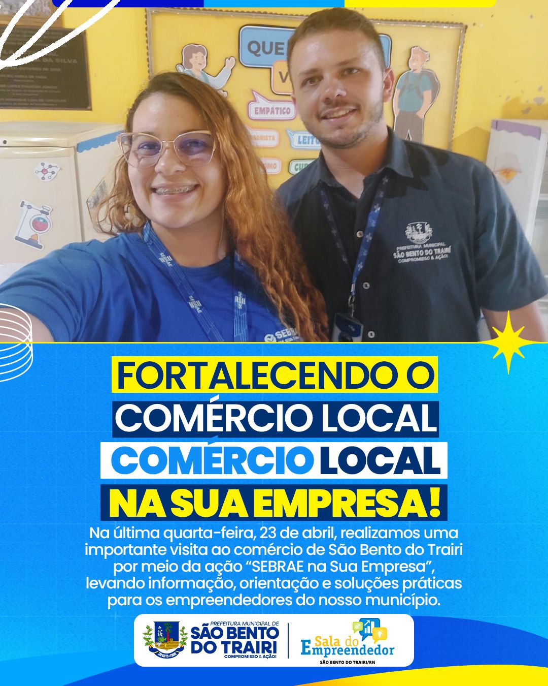 Na última quarta-feira, 23 de abril, realizamos uma importante visita ao comércio de São Bento do Trairi por meio da ação “SEBRAE na Sua Empresa”, levando informação, orientação e soluções práticas para os empreendedores do nosso município.