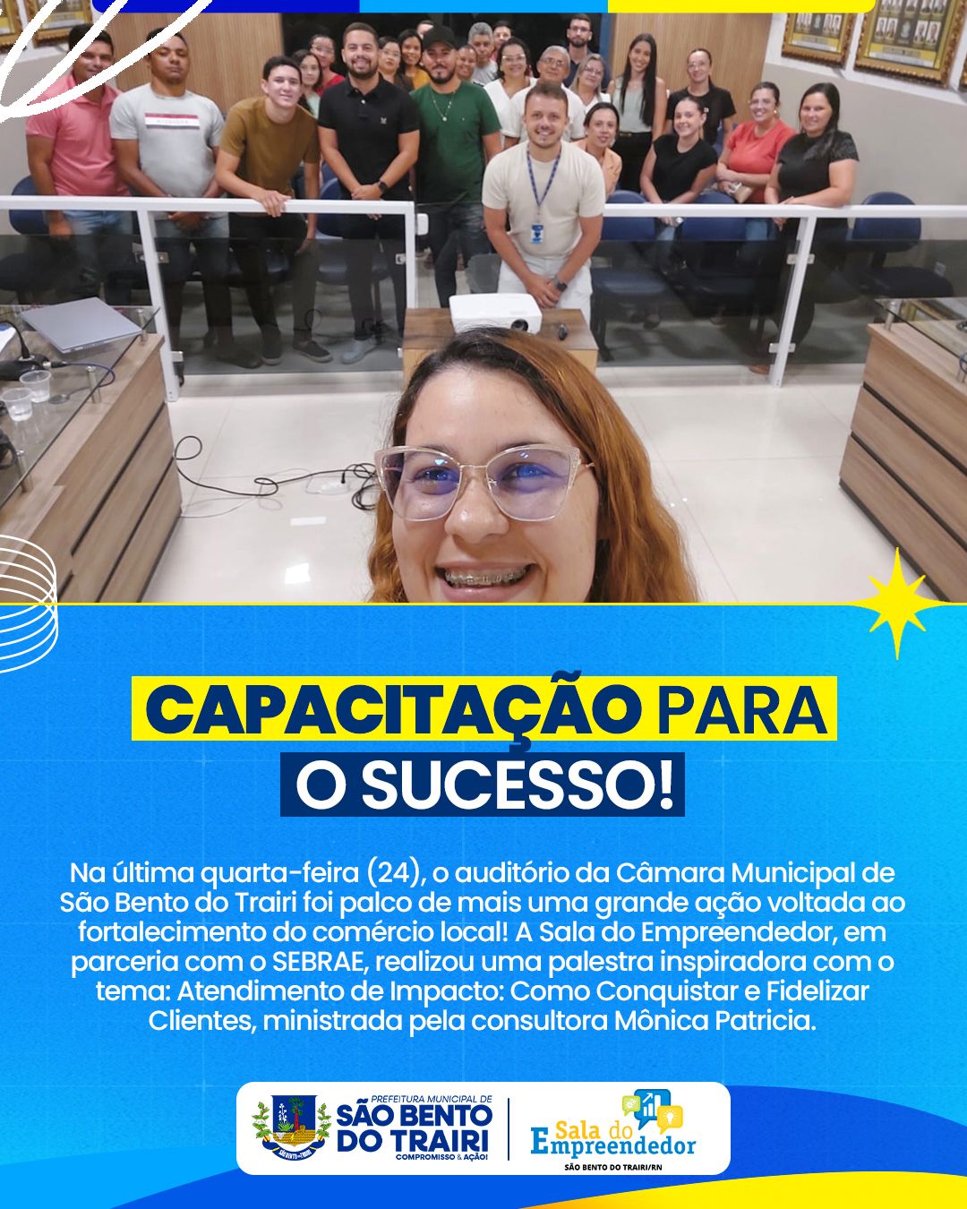 Na última quarta-feira (24), o auditório da Câmara Municipal de São Bento do Trairi foi palco de mais uma grande ação voltada ao fortalecimento do comércio local! A Sala do Empreendedor, em parceria com o SEBRAE, realizou uma palestra inspiradora com o tema: Atendimento de Impacto: Como Conquistar e Fidelizar Clientes, ministrada pela consultora Mônica Patricia.
