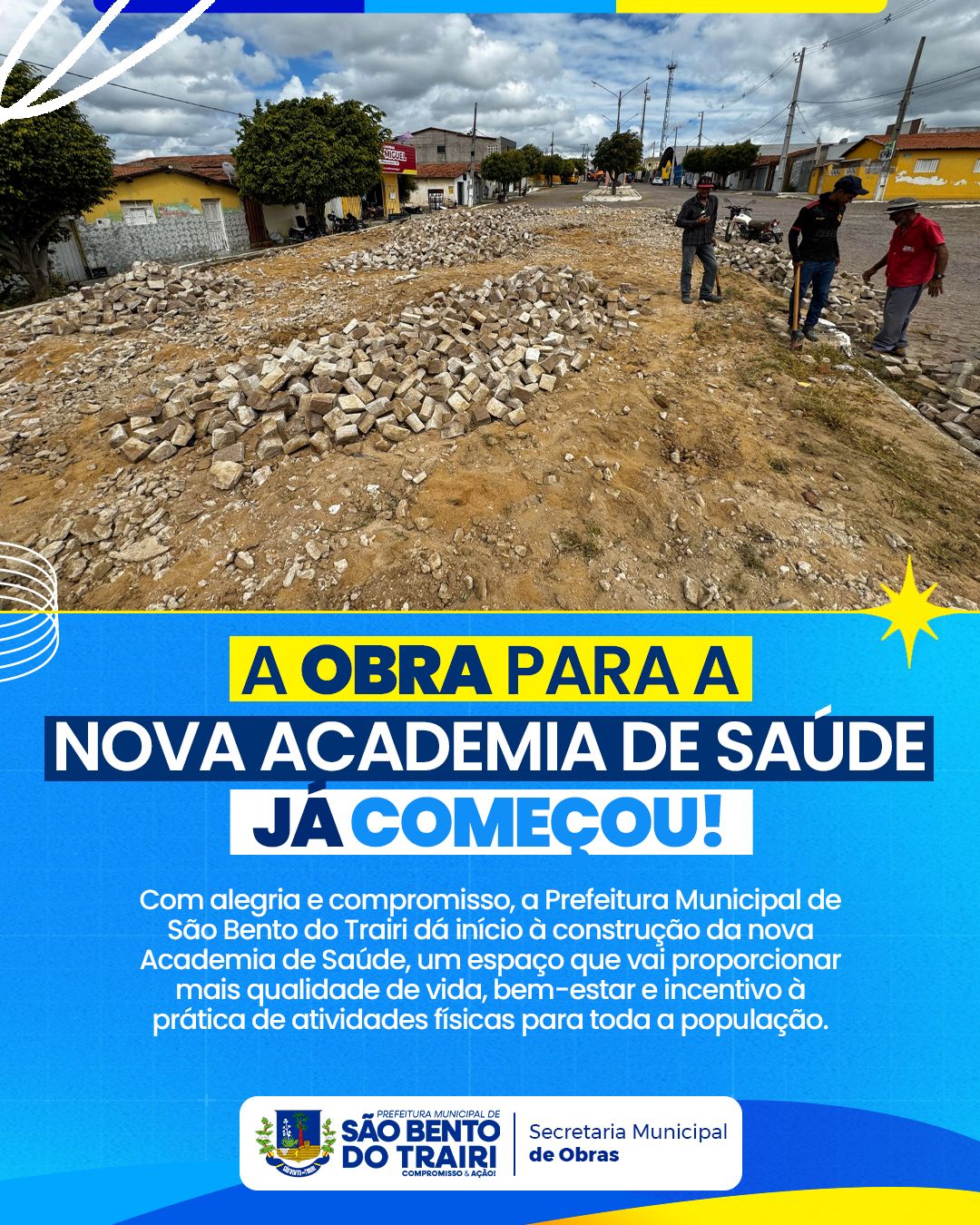 Com alegria e compromisso, a Prefeitura Municipal de São Bento do Trairi dá início à construção da nova Academia de Saúde, um espaço que vai proporcionar mais qualidade de vida, bem-estar e incentivo à prática de atividades físicas para toda a população.