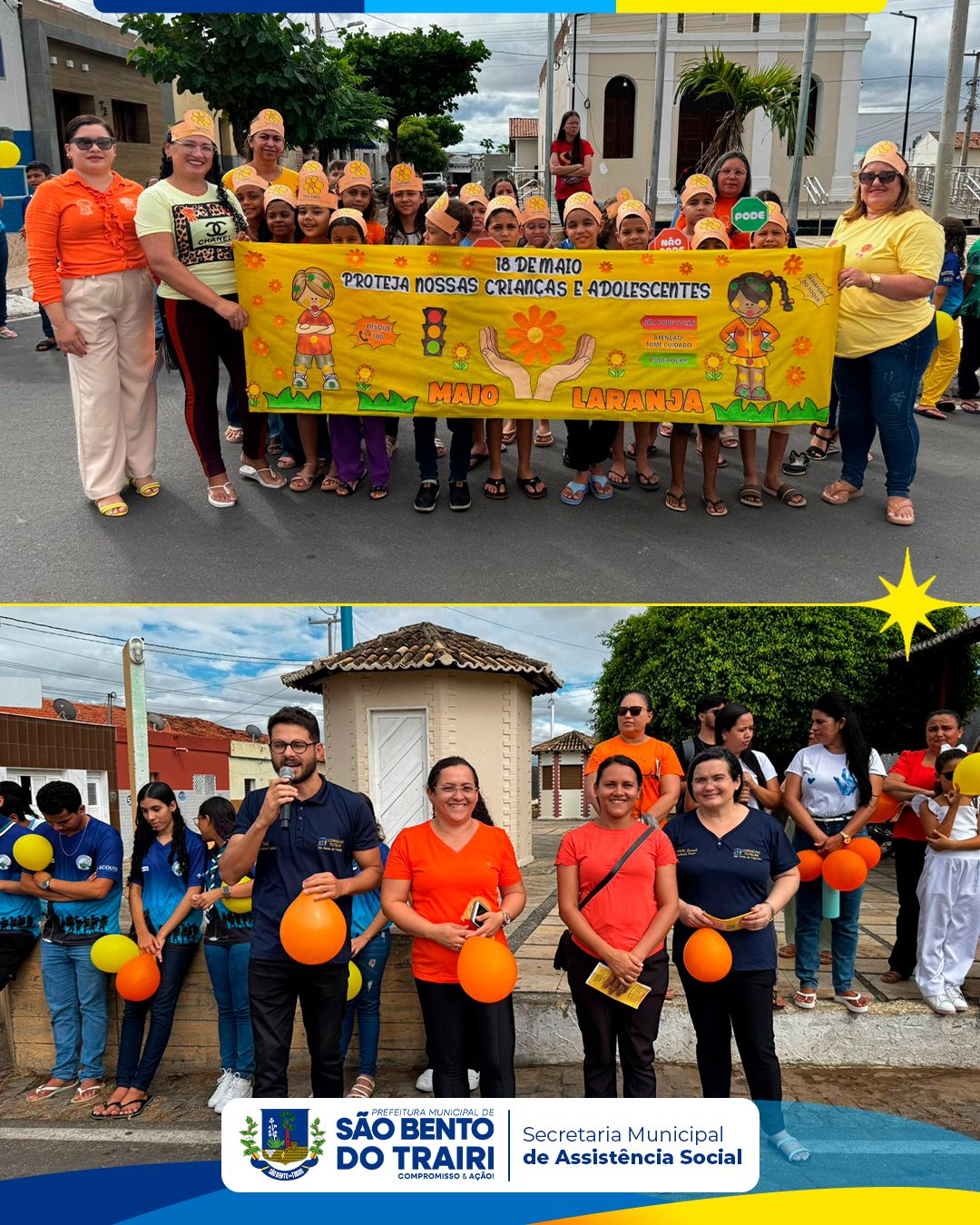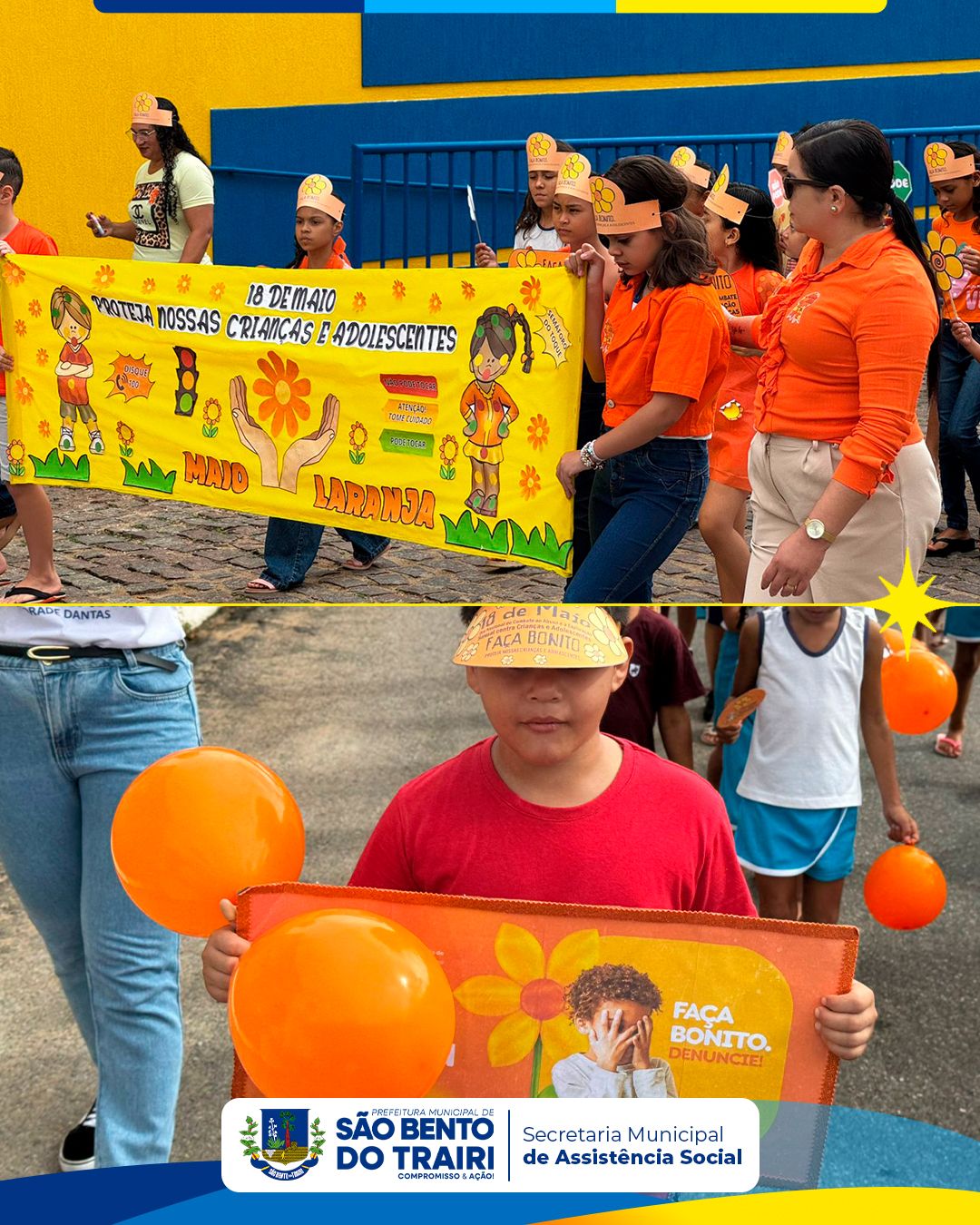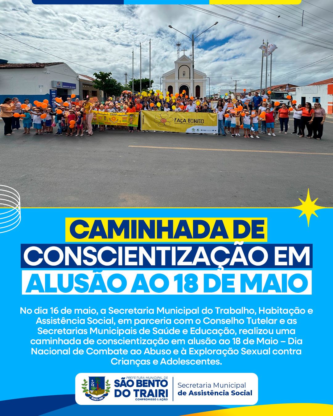 No dia 16 de maio, a Secretaria Municipal do Trabalho, Habitação e Assistência Social, em parceria com o Conselho Tutelar e as Secretarias Municipais de Saúde e Educação, realizou uma caminhada de conscientização em alusão ao 18 de Maio – Dia Nacional de Combate ao Abuso e à Exploração Sexual contra Crianças e Adolescentes.