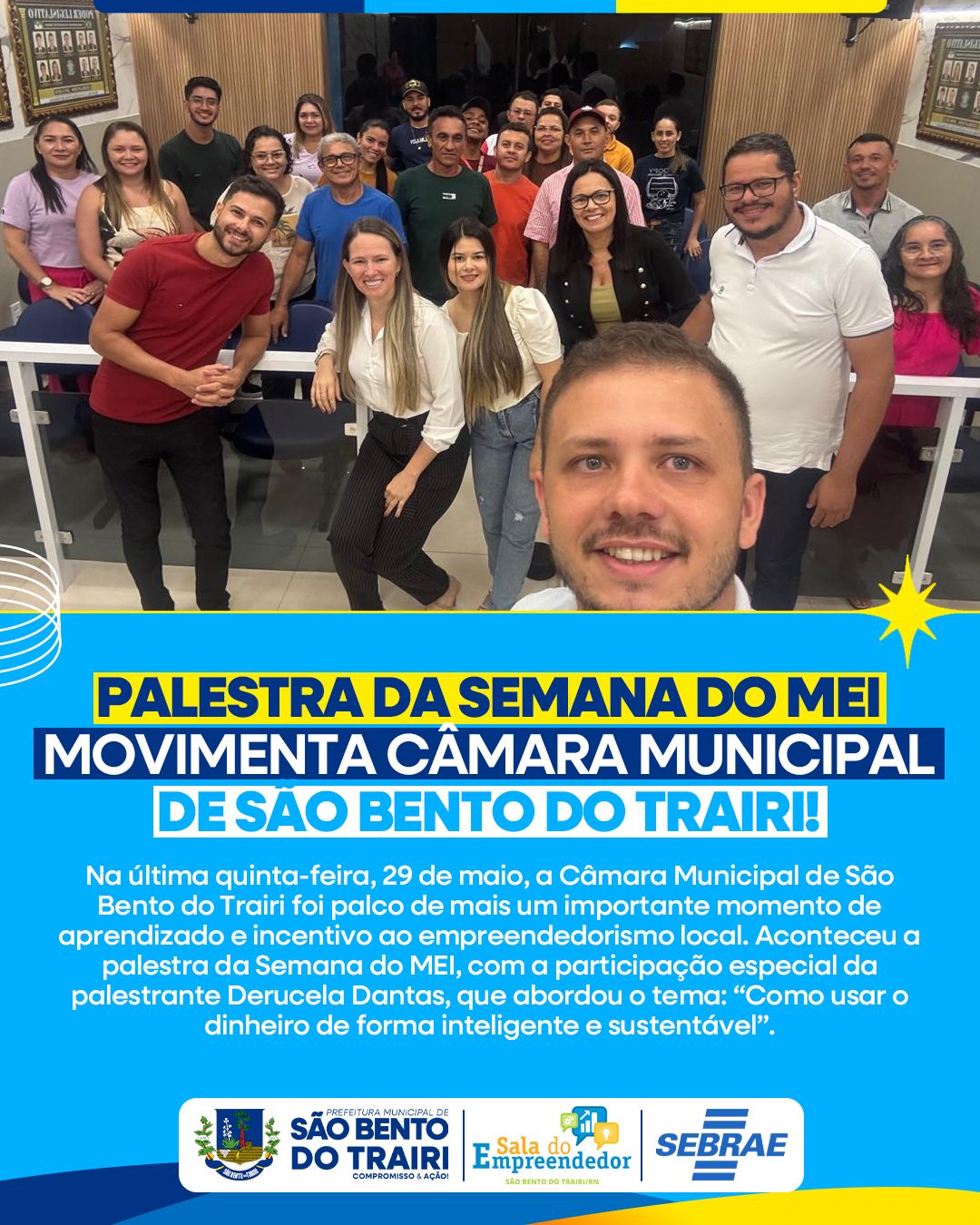 Na última quinta-feira, 29 de maio, a Câmara Municipal de São Bento do Trairi foi palco de mais um importante momento de aprendizado e incentivo ao empreendedorismo local. Aconteceu a palestra da Semana do MEI, com a participação especial da palestrante Derucela Dantas, que abordou o tema: “Como usar o dinheiro de forma inteligente e sustentável”.