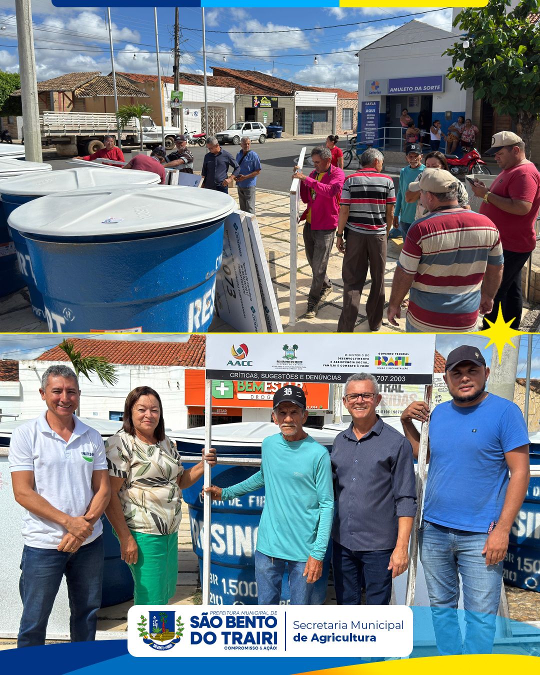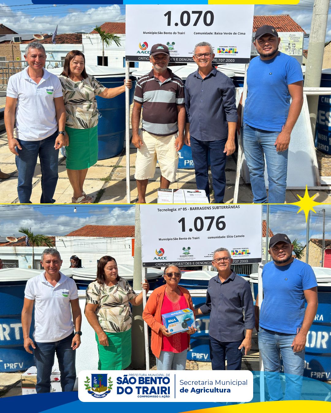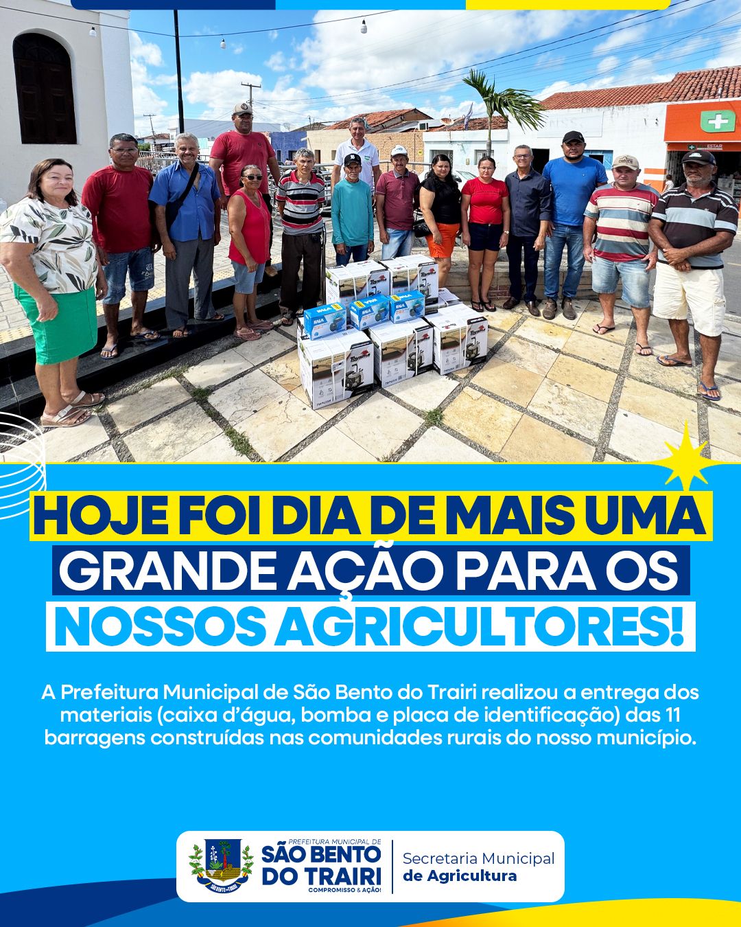 A Prefeitura Municipal de São Bento do Trairi realizou a entrega dos materiais (caixa d’água, bomba e placa de identificação) das 11 barragens construídas nas comunidades rurais do nosso município.