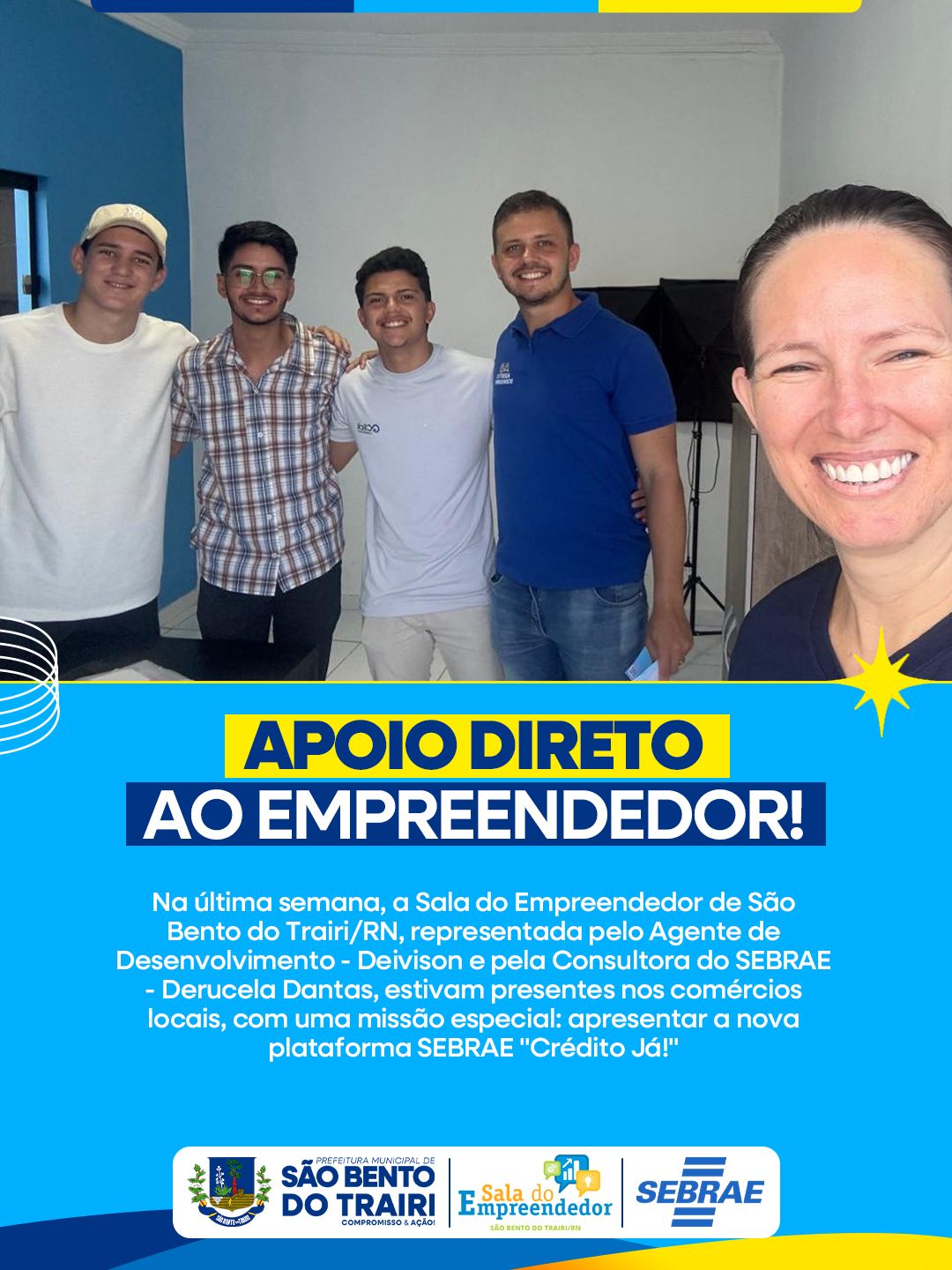 Na última semana, a Sala do Empreendedor de São Bento do Trairi/RN, representada pelo Agente de Desenvolvimento - Deivison e pela Consultora do SEBRAE - Derucela Dantas, estivam presentes nos comércios locais, com uma missão especial: apresentar a nova plataforma SEBRAE ‘’Crédito Já!’’