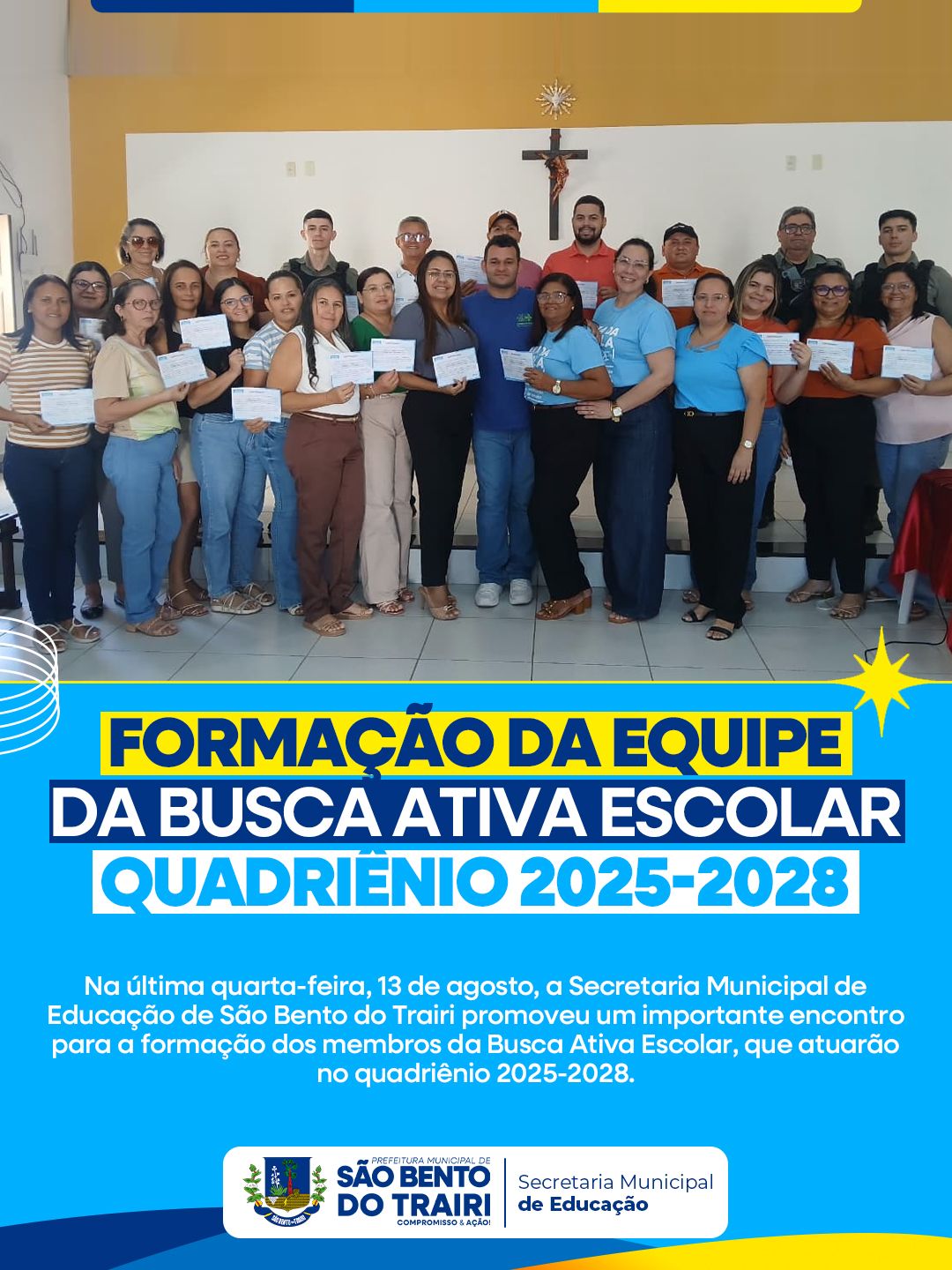 Na última quarta-feira, 13 de agosto, a Secretaria Municipal de Educação de São Bento do Trairi promoveu um importante encontro para a formação dos membros da Busca Ativa Escolar, que atuarão no quadriênio 2025-2028.