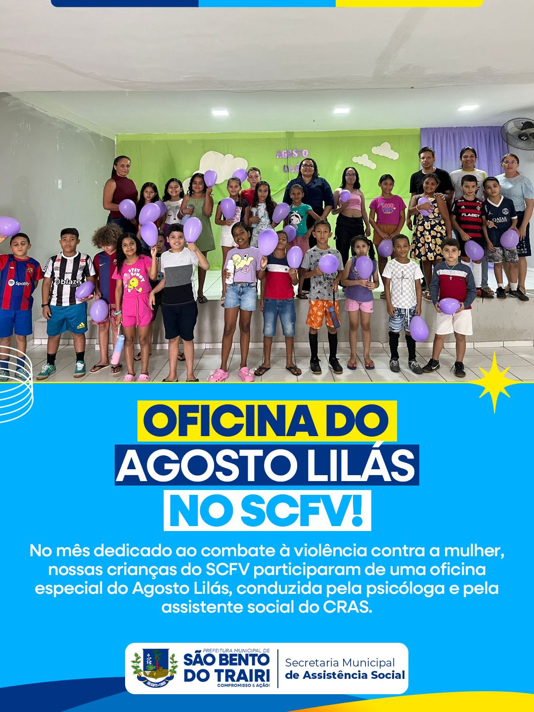 No mês dedicado ao combate à violência contra a mulher, nossas crianças do SCFV participaram de uma oficina especial do Agosto Lilás, conduzida pela psicóloga e pela assistente social do CRAS.