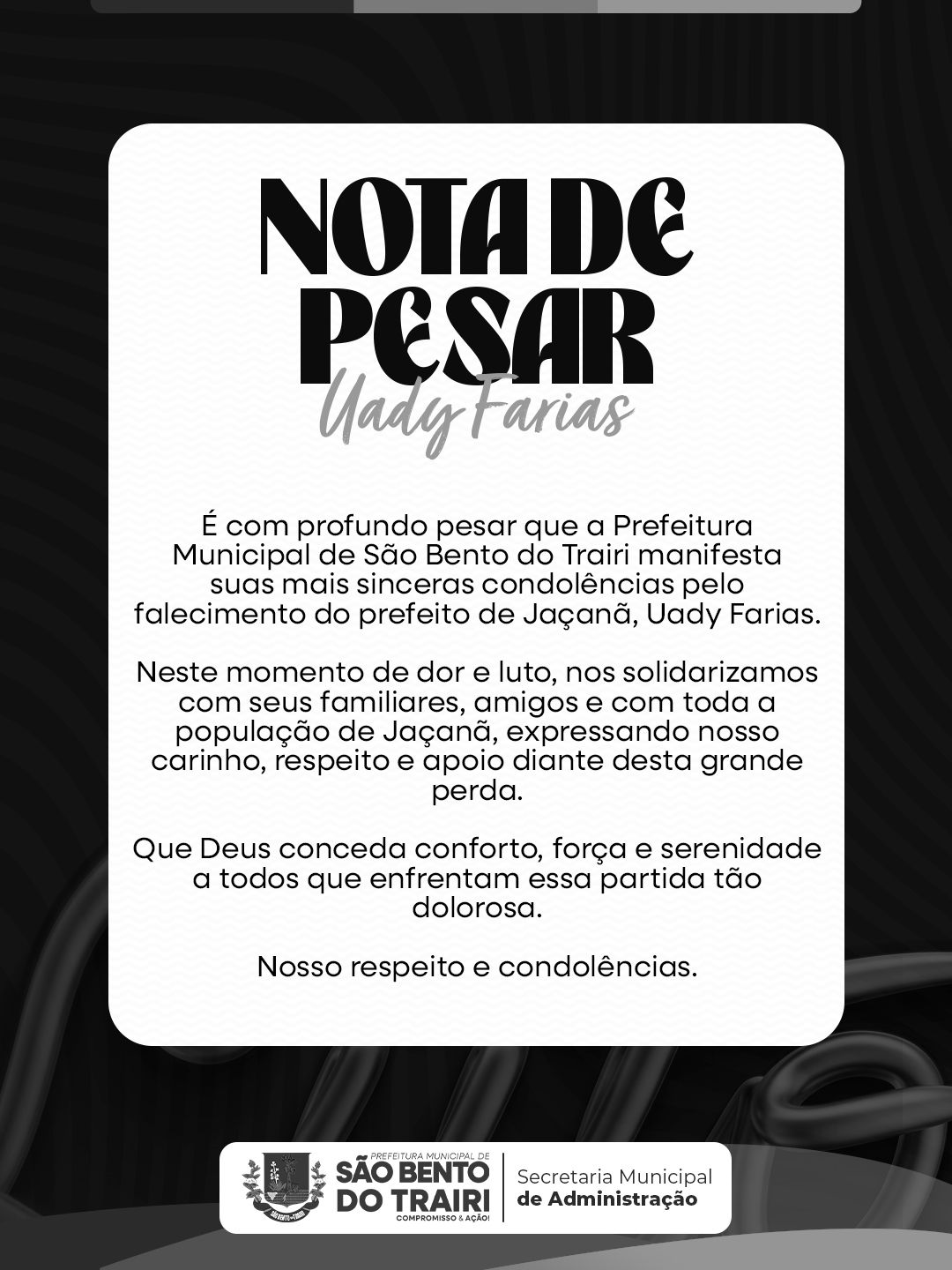 É com profundo pesar que a Prefeitura Municipal de São Bento do Trairi manifesta suas mais sinceras condolências pelo falecimento do prefeito de Jaçanã, Uady Farias.