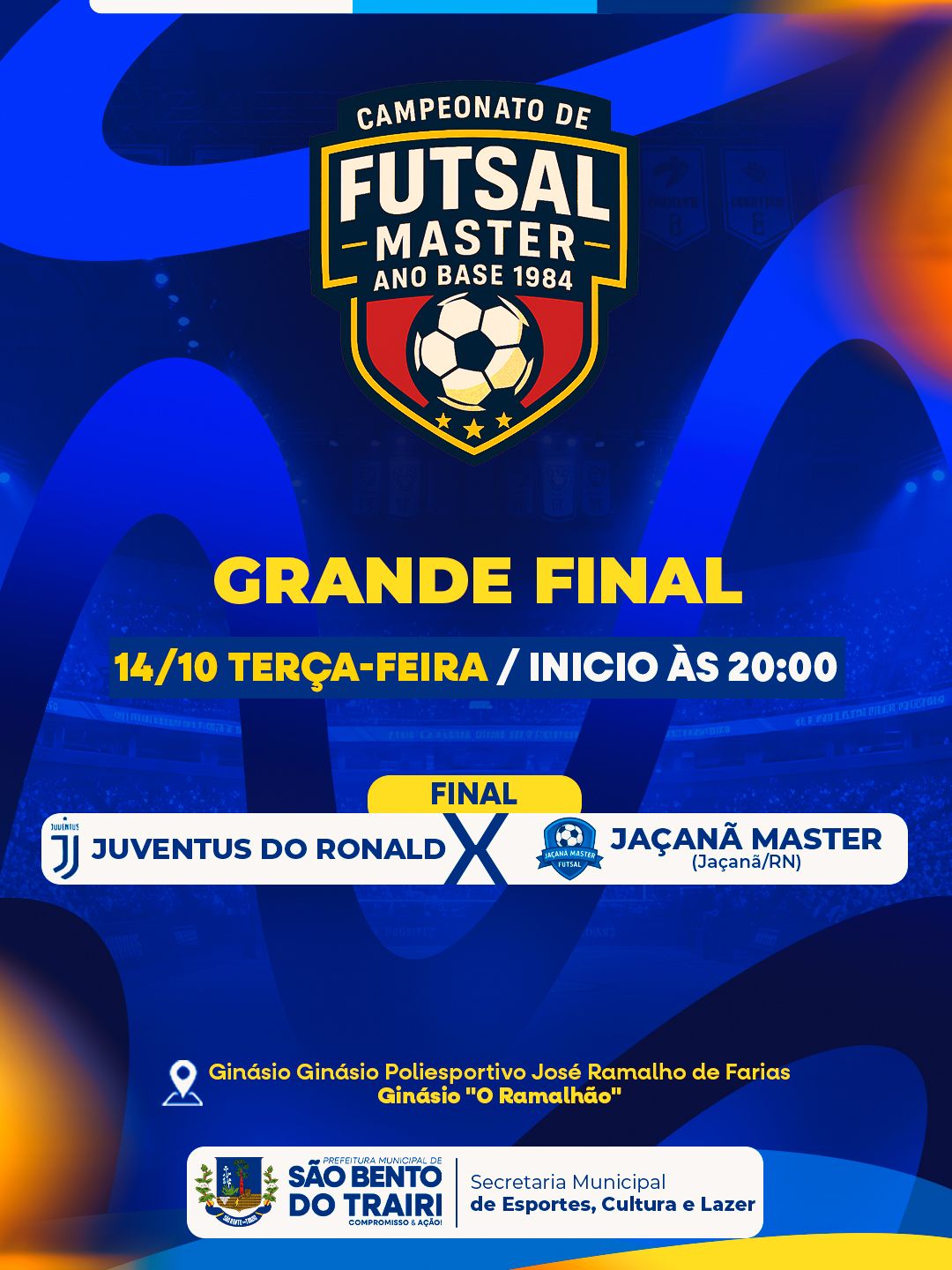 A grande final do Campeonato de Futsal Master acontece na próxima terça-feira, dia 14 de outubro, às 20h, no ginásio.