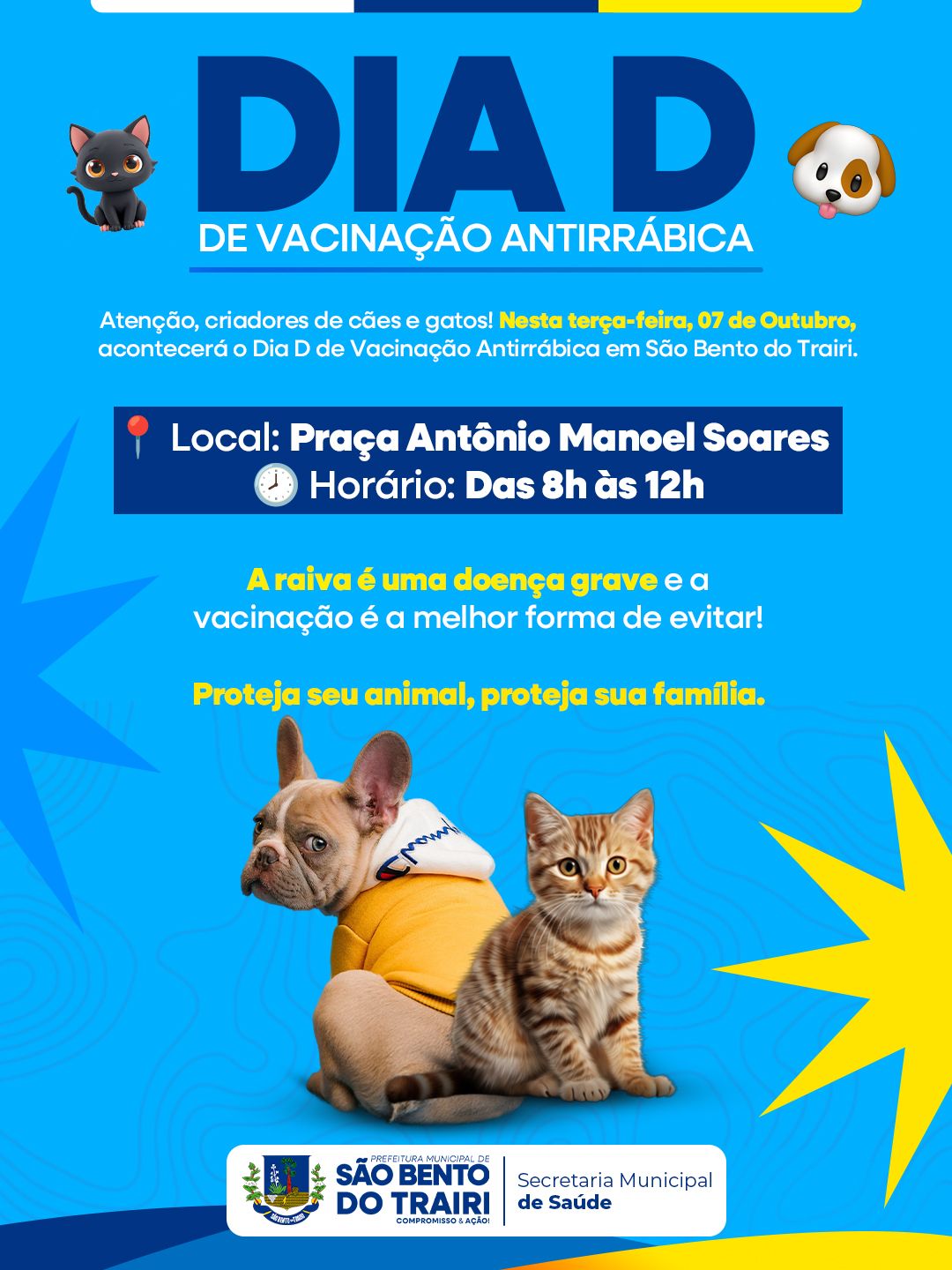 Atenção, criadores de cães e gatos! Nesta terça-feira, 07 de Outubro, acontecerá o Dia D de Vacinação Antirrábica em São Bento do Trairi.
