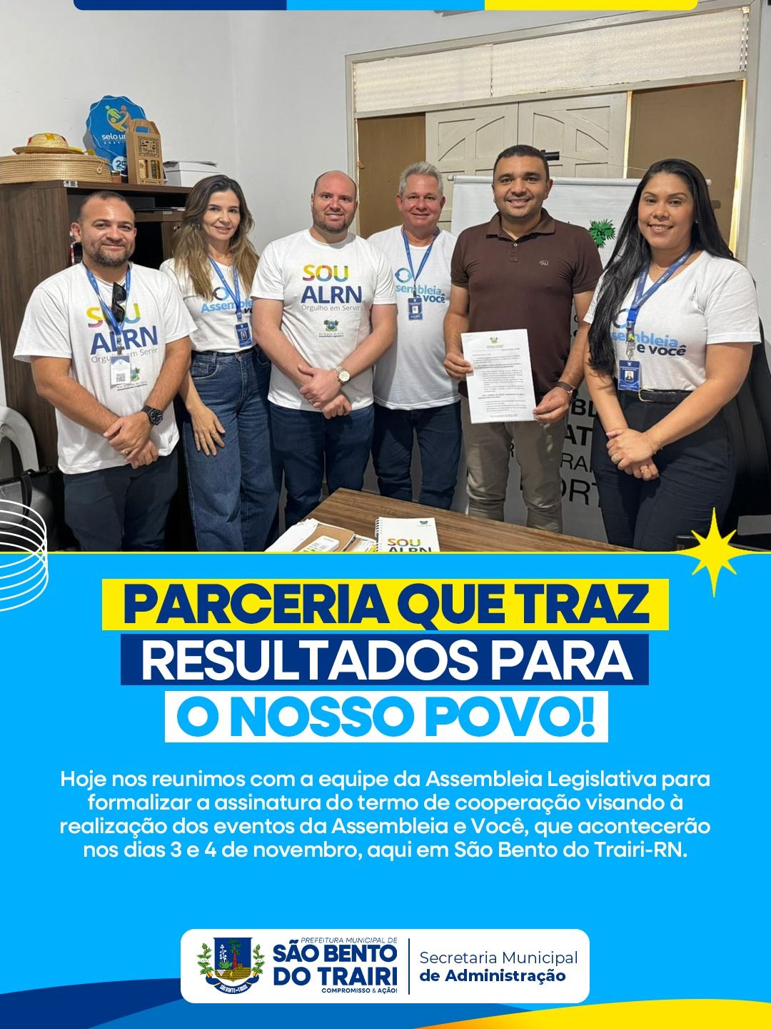 Hoje nos reunimos com a equipe da Assembleia Legislativa para formalizar a assinatura do termo de cooperação visando à realização dos eventos da Assembleia e Você, que acontecerão nos dias 3 e 4 de novembro, aqui em São Bento do Trairi-RN.