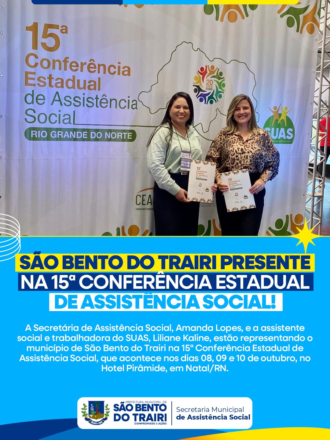 A Secretária de Assistência Social, Amanda Lopes, e a assistente social e trabalhadora do SUAS, Liliane Kaline, estão representando o município de São Bento do Trairi na 15ª Conferência Estadual de Assistência Social, que acontece nos dias 08, 09 e 10 de outubro, no Hotel Pirâmide, em Natal/RN.
