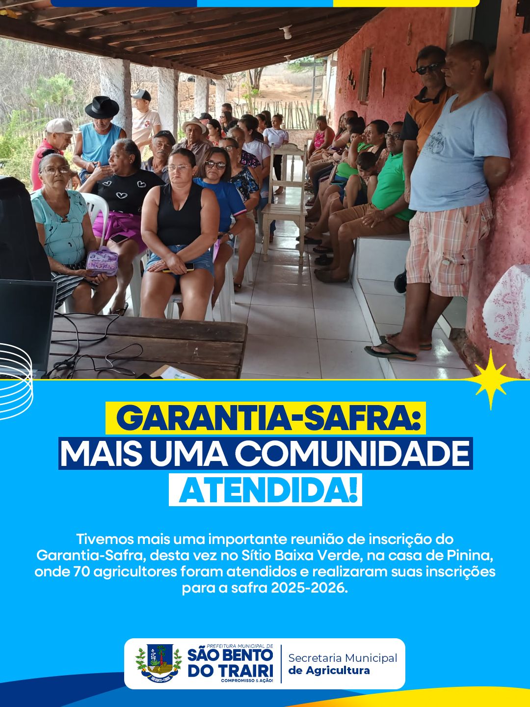 Tivemos mais uma importante reunião de inscrição do Garantia-Safra, desta vez no Sítio Baixa Verde, na casa de Pinina, onde 70 agricultores foram atendidos e realizaram suas inscrições para a safra 2025-2026.