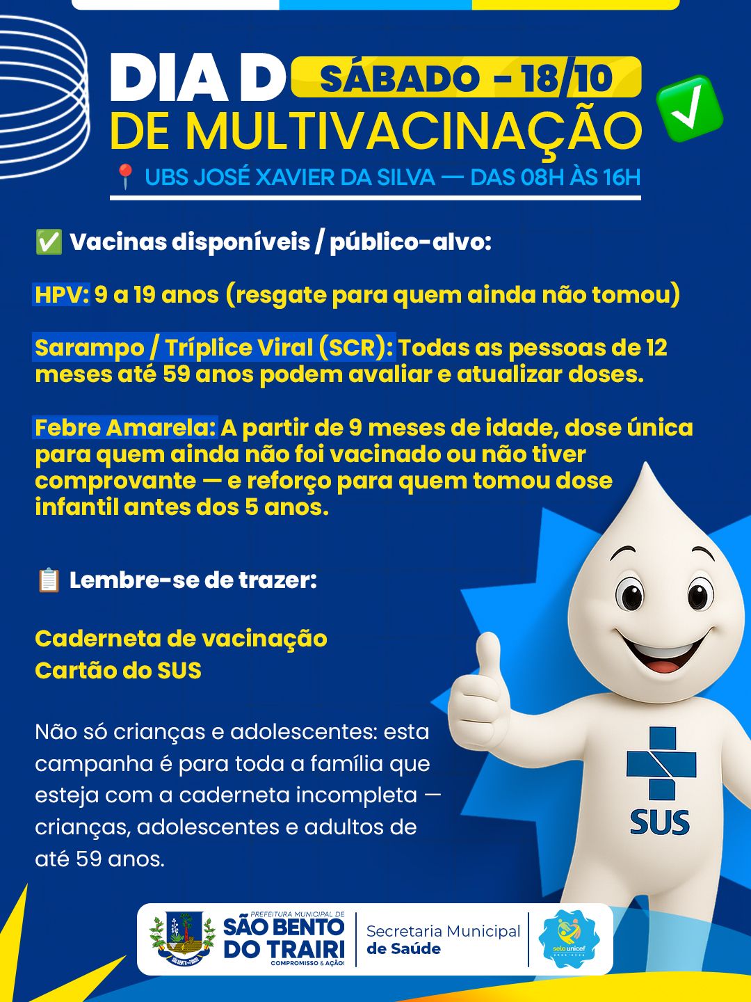 Dia D de Multivacinação — Sábado, 18/10/2025 UBS José Xavier da Silva — das 08h às 16h