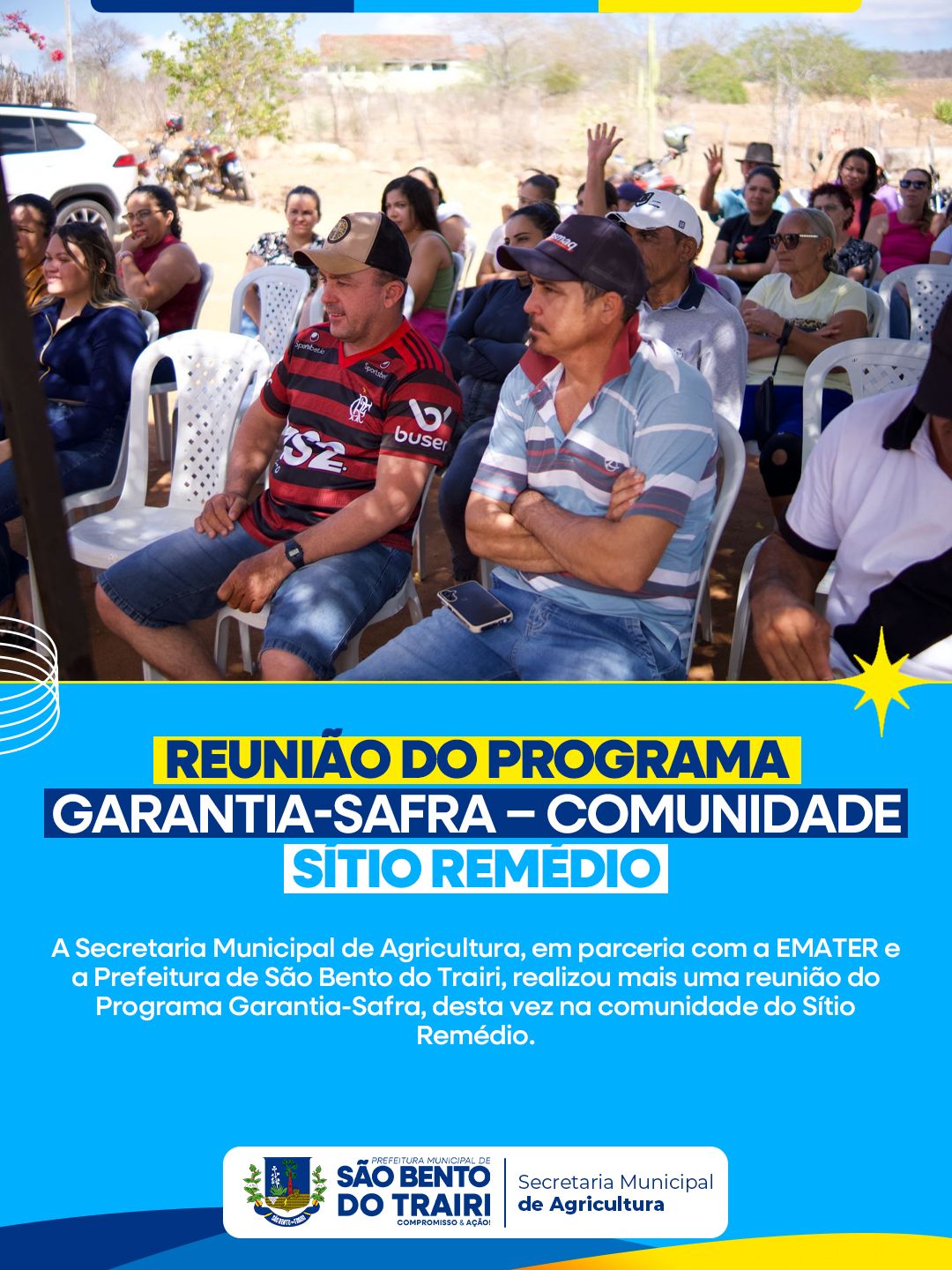 A Secretaria Municipal de Agricultura, em parceria com a EMATER e a Prefeitura de São Bento do Trairi, realizou mais uma reunião do Programa Garantia-Safra, desta vez na comunidade do Sítio Remédio.