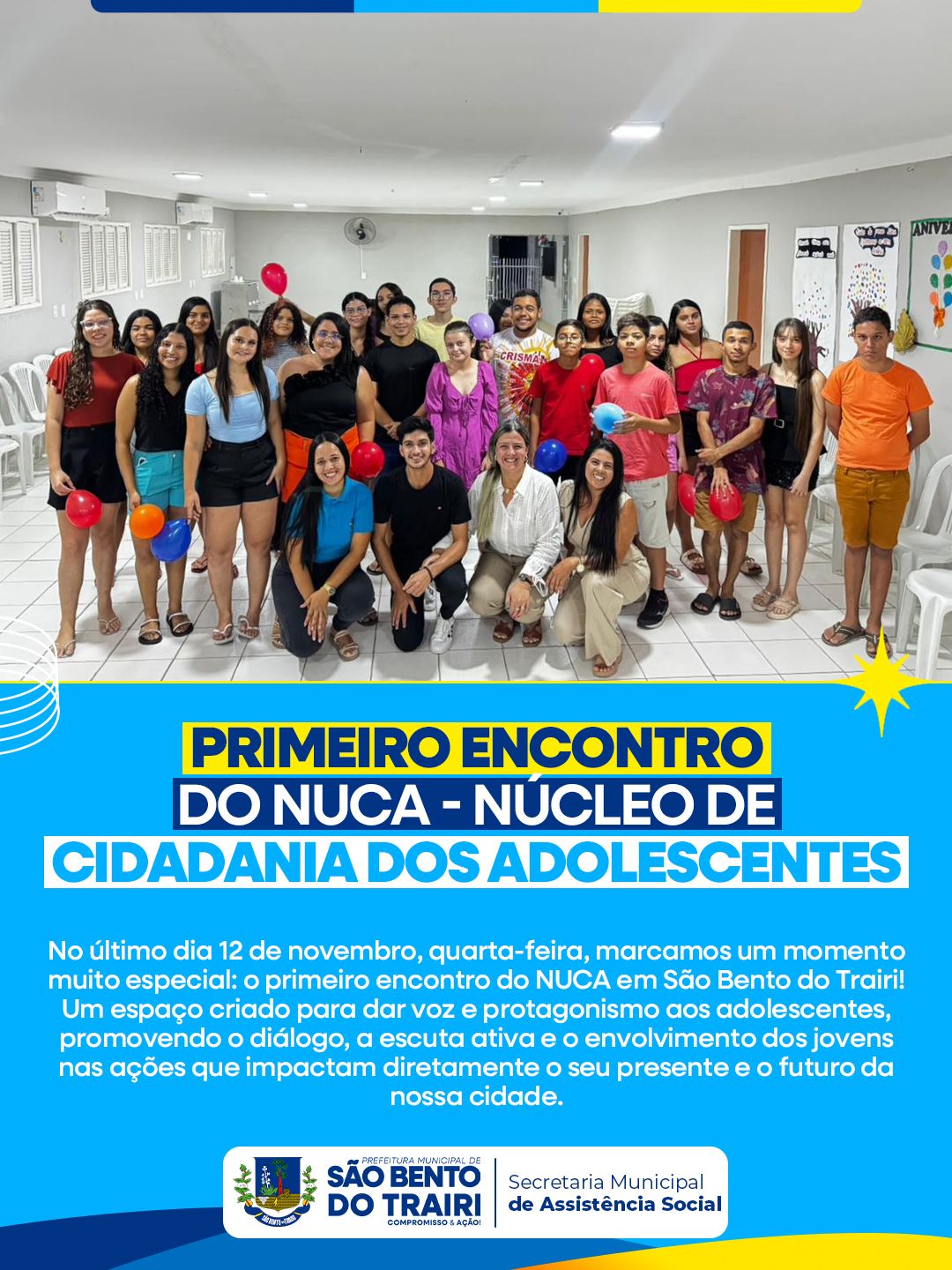 No último dia 12 de novembro, quarta-feira, marcamos um momento muito especial: o primeiro encontro do NUCA em São Bento do Trairi! Um espaço criado para dar voz e protagonismo aos adolescentes, promovendo o diálogo, a escuta ativa e o envolvimento dos jovens nas ações que impactam diretamente o seu presente e o futuro da nossa cidade.