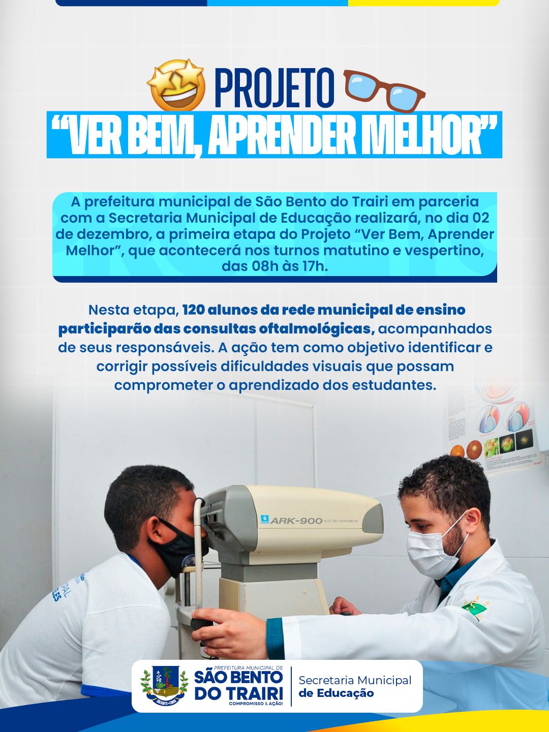 A prefeitura municipal de São Bento do Trairi em parceria com a Secretaria Municipal de Educação realizará, no dia 02 de dezembro, a primeira etapa do Projeto “Ver Bem, Aprender Melhor”, que acontecerá nos turnos matutino e vespertino, das 08h às 17h.
