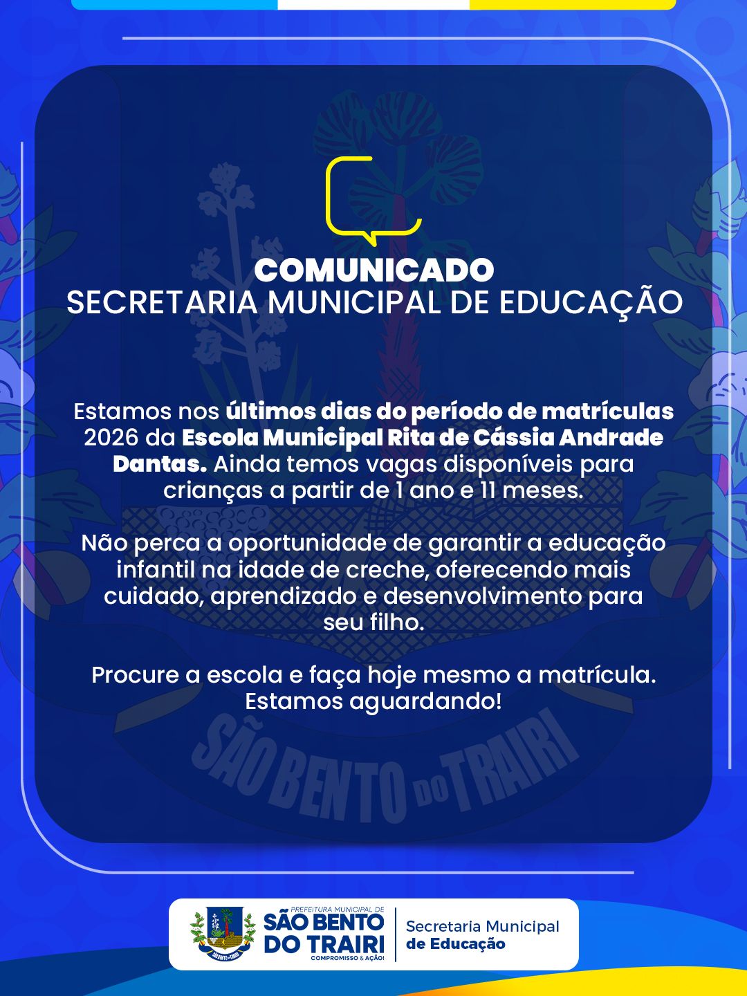 Estamos nos últimos dias do período de matrículas 2026 da Escola Municipal Rita de Cássia Andrade Dantas. Ainda temos vagas disponíveis para crianças a partir de 1 ano e 11 meses.