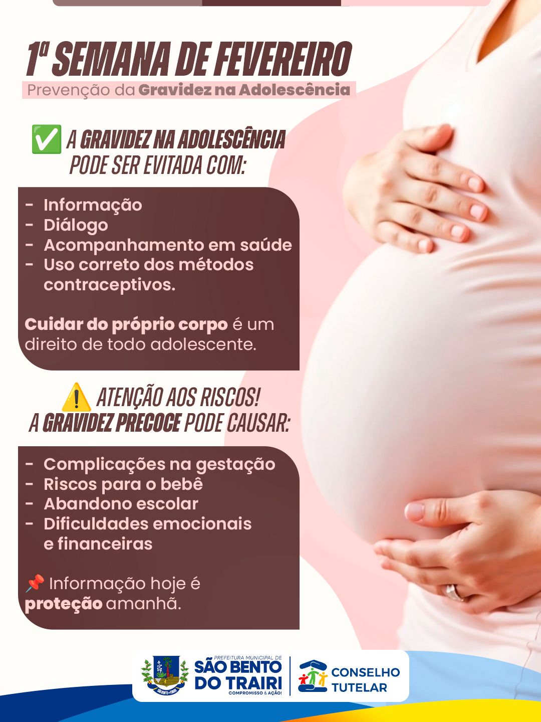 Atenção aos riscos! A gravidez precoce pode causar: - Complicações na gestação - Riscos para o bebê - Abandono escolar - Dificuldades emocionais e financeiras