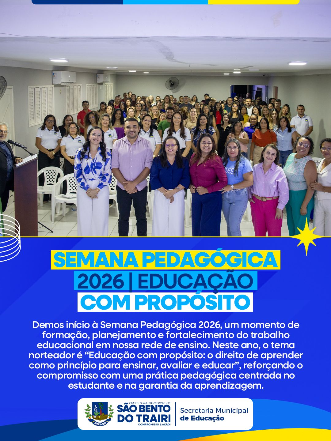 Demos início à Semana Pedagógica 2026, um momento de formação, planejamento e fortalecimento do trabalho educacional em nossa rede de ensino. Neste ano, o tema norteador é “Educação com propósito: o direito de aprender como princípio para ensinar, avaliar e educar”, reforçando o compromisso com uma prática pedagógica centrada no estudante e na garantia da aprendizagem.
