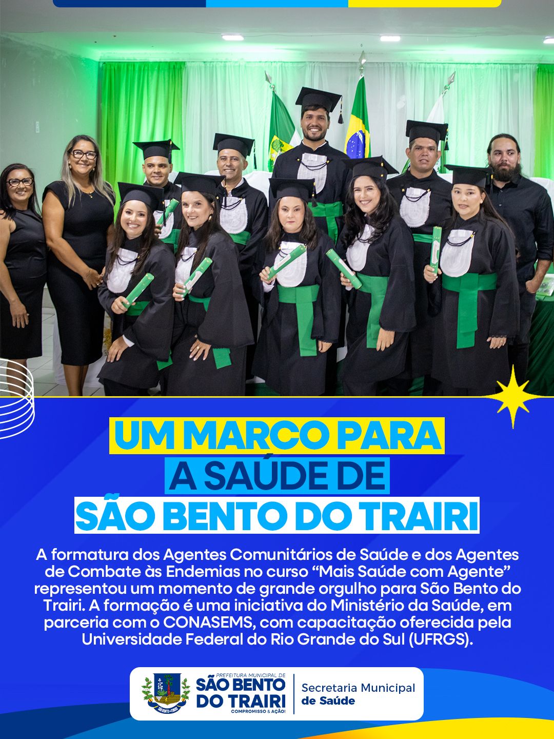 A formatura dos Agentes Comunitários de Saúde e dos Agentes de Combate às Endemias no curso “Mais Saúde com Agente” representou um momento de grande orgulho para São Bento do Trairi. A formação é uma iniciativa do Ministério da Saúde, em parceria com o CONASEMS, com capacitação oferecida pela Universidade Federal do Rio Grande do Sul (UFRGS).