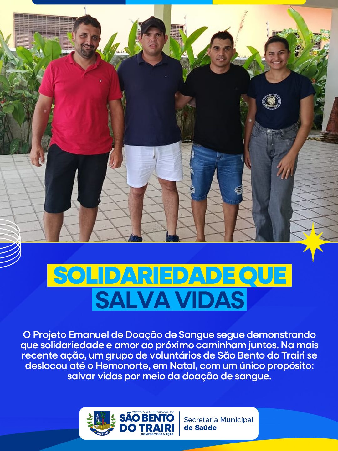 O Projeto Emanuel de Doação de Sangue segue demonstrando que solidariedade e amor ao próximo caminham juntos. Na mais recente ação, um grupo de voluntários de São Bento do Trairi se deslocou até o Hemonorte, em Natal, com um único propósito: salvar vidas por meio da doação de sangue.