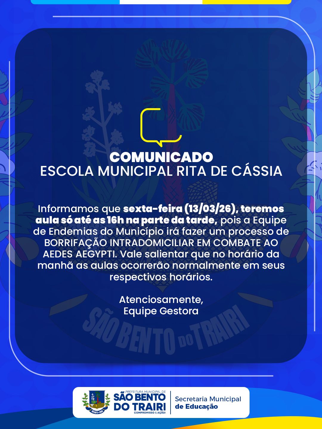 Informamos que sexta-feira (13/03/26), teremos aula só até as 16h na parte da tarde, pois a Equipe de Endemias do Município irá fazer um processo de BORRIFAÇÃO INTRADOMICILIAR EM COMBATE AO AEDES AEGYPTI. Vale salientar que no horário da manhã as aulas ocorrerão normalmente em seus respectivos horários.