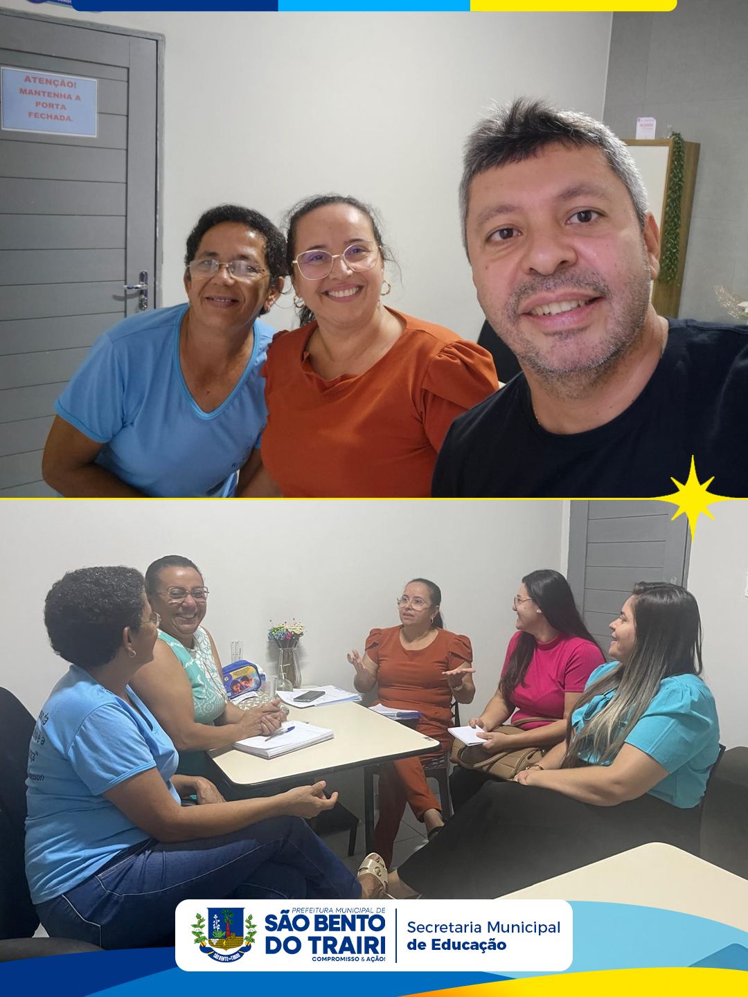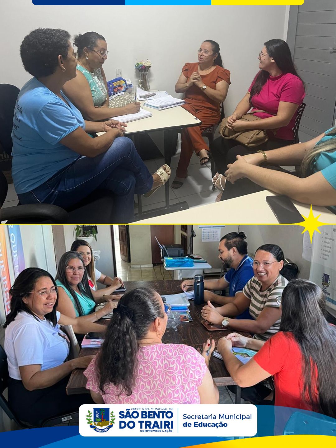 A Secretária Municipal de Educação realizou uma reunião com as equipes gestoras das escolas José Ribeiro e Rita de Cássia, com o objetivo de alinhar e planejar ações pedagógicas e administrativas.